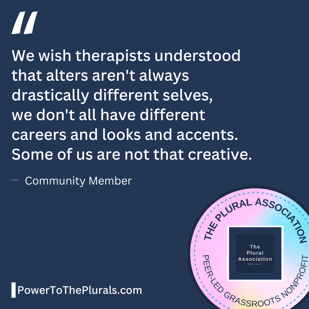 TPA is committed to transforming the therapeutic landscape by reducing recovery setbacks, promoting inclusive practices, and amplifying Plural voices through comprehensive resources and community insights. We receive weekly emails from Plurals urgently seeking Plural-competent therapists, underscoring the essential need for our work.